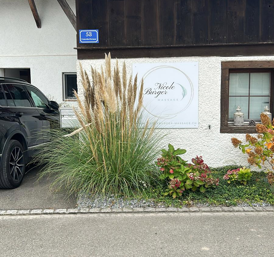 Zur visuellen Präsenz gehören zudem Flyer, Visitenkarten und eine Werbetafel an der Hauswand – gut sichtbar von der Strasse aus.